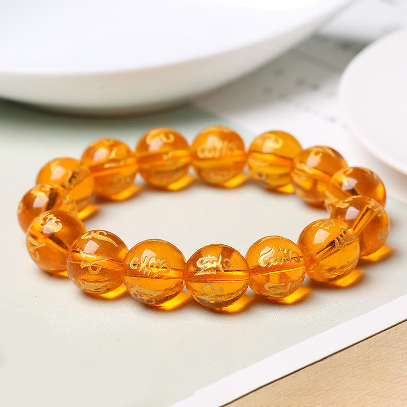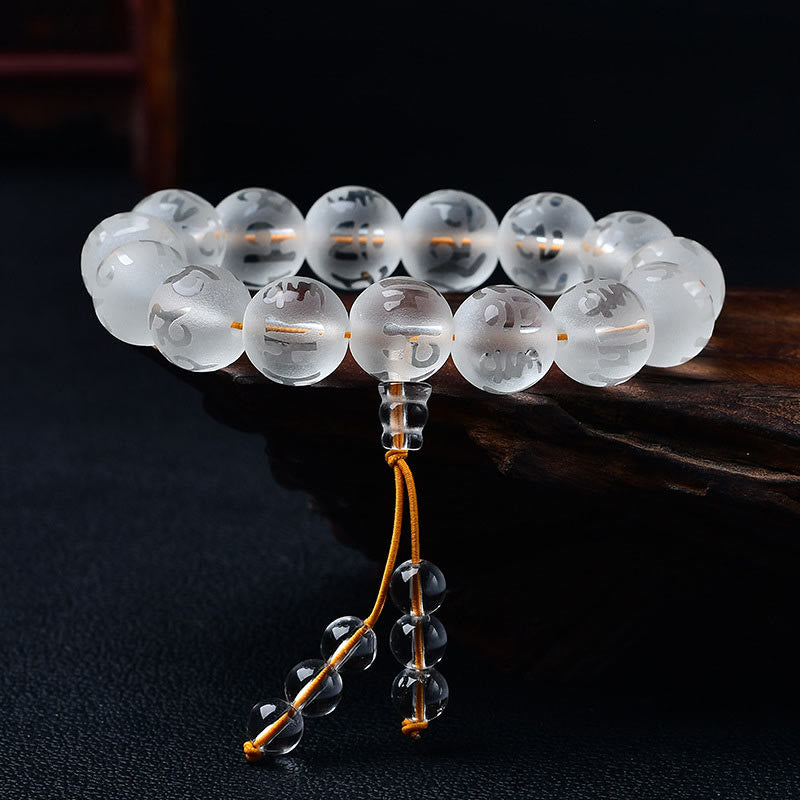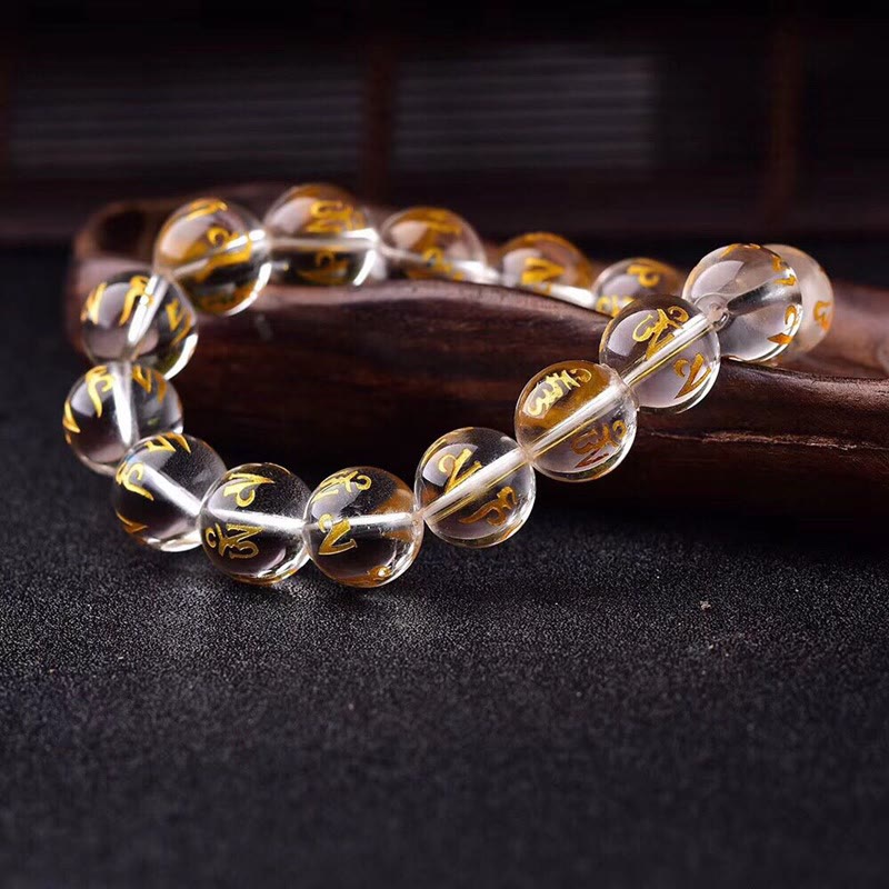 Dieses handgefertigte Armband kombiniert weißen Kristall und schwarzen Onyx mit dem Mantra Om Mani Padme Hum. Es steht in der Beschreibung für Klarheit, Fokus und Schutz und wirkt dabei ruhig und unaufdringlich.